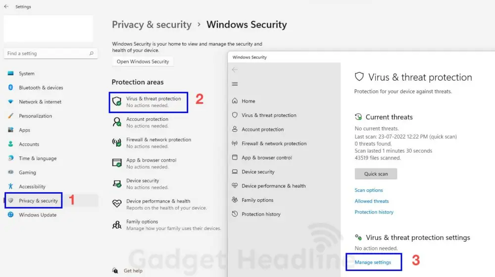 • Then click on Manage settings under the Virus & threat protection settings option.